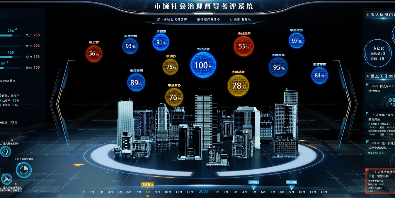 基于大数据中心,通过数据挖掘、在线分析等手段,以简洁、直观的界面,展现城市各环节的运行趋势,从而提供分析和管理上的帮助,洞察大数据时代的政府治理情况,为城市管理者提供辅助决策数据依据。